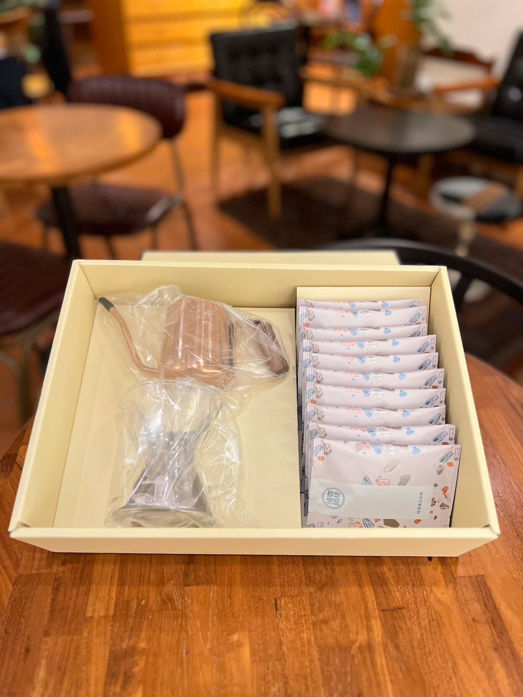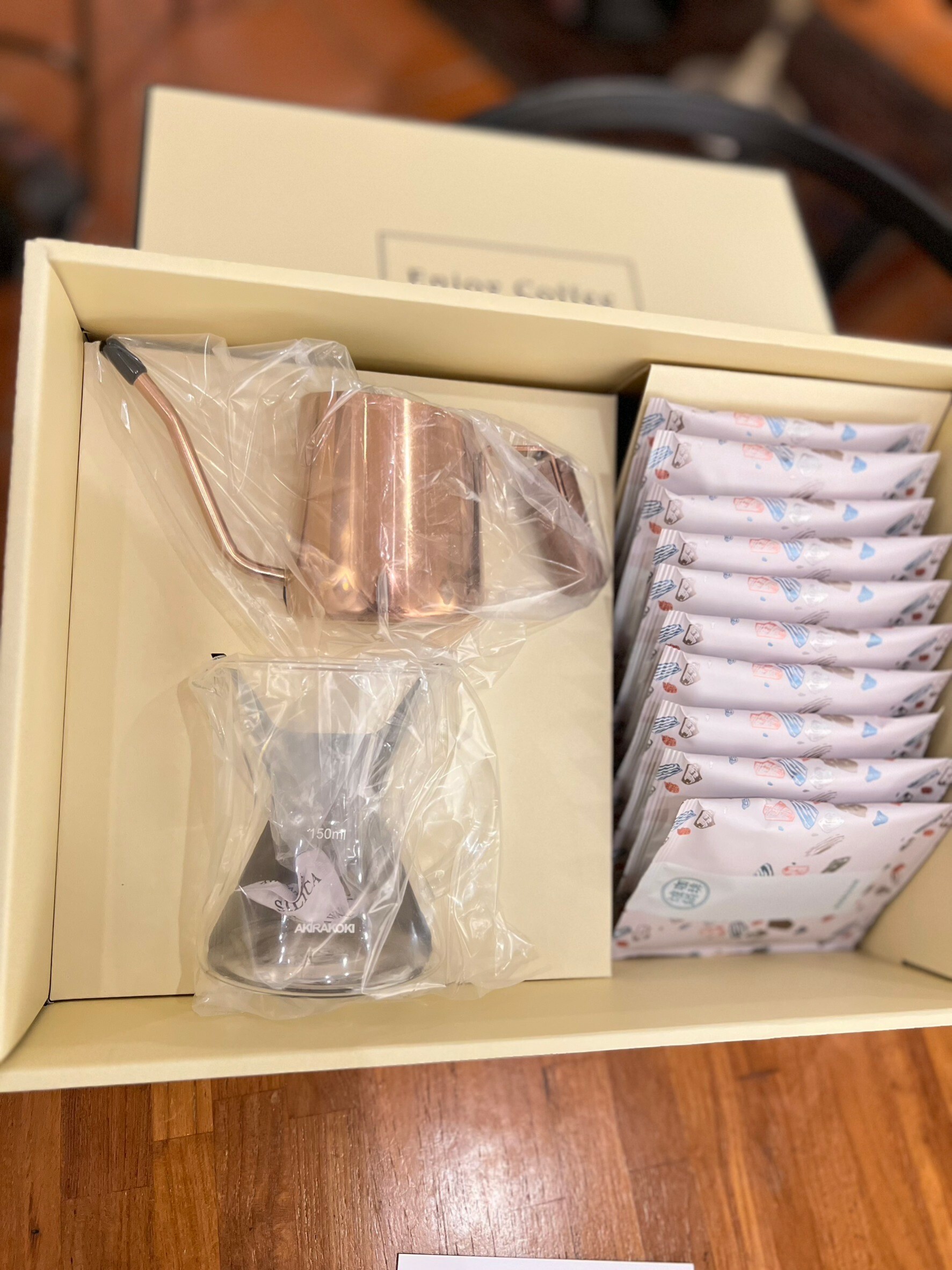 美味的瑰夏咖啡製作成方便的掛耳式咖啡包,搭配玫瑰金色原木手把的專用手沖壺、專用的玻璃下壺,隨時隨地都有儀式感的頂級享受。