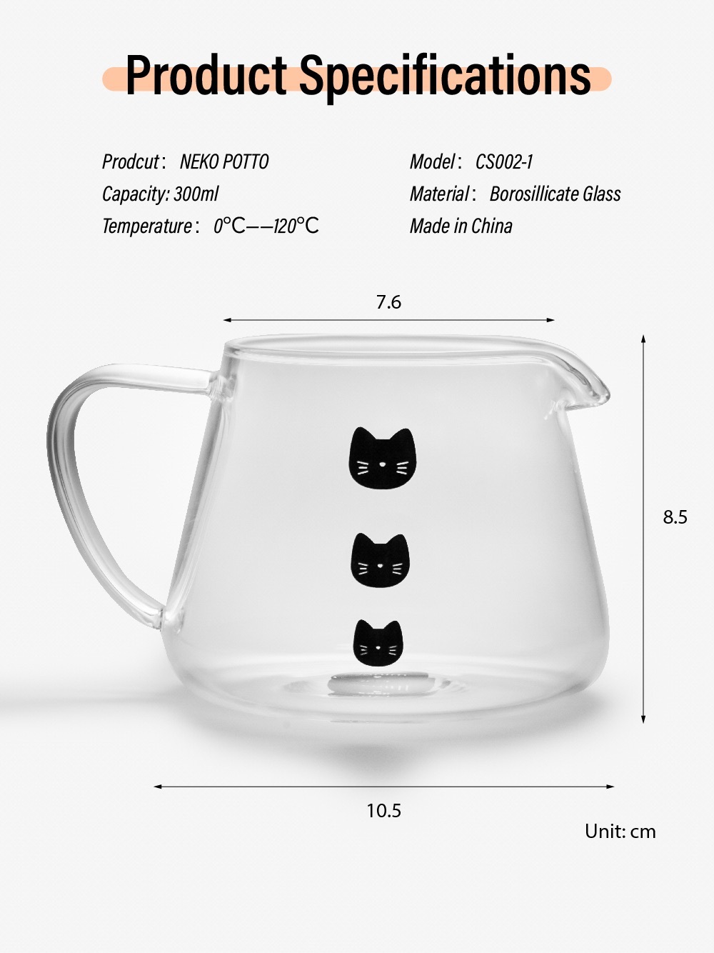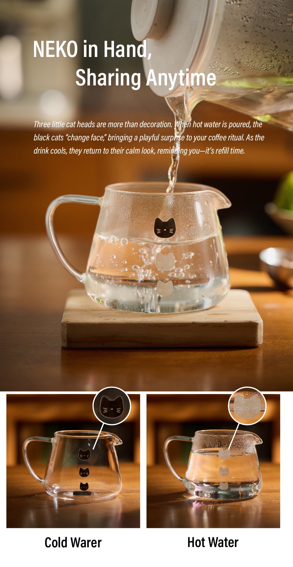 趣味溫感變色: 倒入熱咖啡時,壺身上的黑貓圖案會隨溫度轉變為白貓,增添互動樂趣。